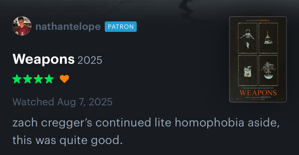I’m a big believer in artists caring for the craft enough to make the effort of being understood. Many artists throw out a bunch of shit that they enjoy and hope that people receive it without first doing the work of translating their thoughts. But what makes Weapons work (again, I think this movie fucking rips) is that it is an intentional philosophy. Cregger’s other storytelling skills of timing, character writing, shooting a suburban hallway to evoke maximum dread, and building to bombastic moments mean that he can get away with throwing together a mishmash of instincts and outputting a story folks can both find entertaining and draw deep meaning from.